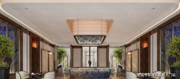 「入户门头」形取和平饭店经典拱门,配以碧绿色天然石材门套、彩玻花窗,重现百年外滩门廊的尊崇仪式。