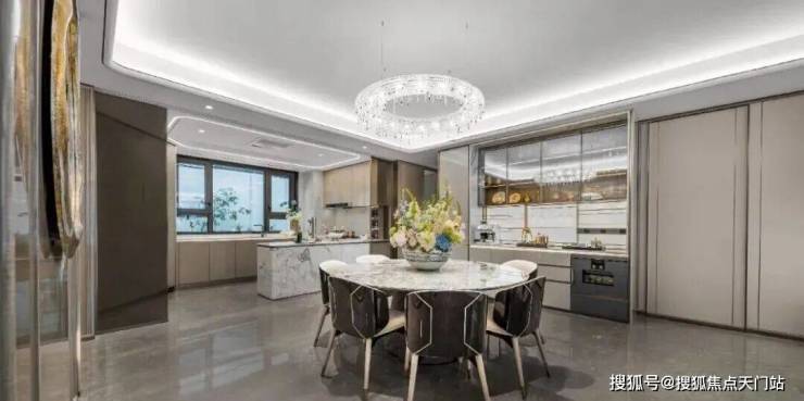 玄关、客餐联厅、厨房与阳台一体贯通,形成建面约100㎡社交巨厅,可容纳10人大圆桌,聚合社交、筵席、娱乐等多元场景,尽享欢宴与聚会。