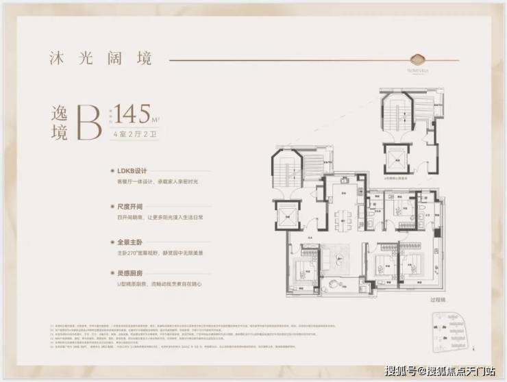 1、建面约145平户型热销且紧缺四房产品,类一梯一户设计,边套转角窗搭配超高窗墙比,采光通透,兼具功能与尺度的双重要求;