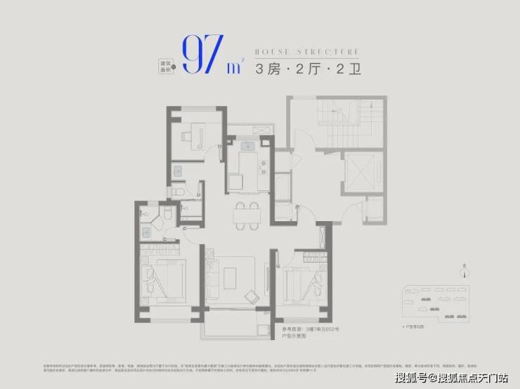 建面约97㎡3房2卫,升级版大3房,入户玄关+主卧套房设计,整体私密性更强,空间更为宽敞。