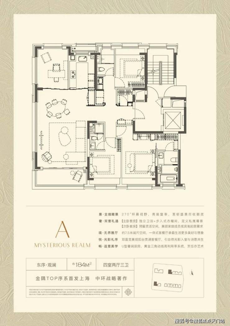【约184㎡样板间】四房两厅三卫格局,LDKB一体化设计,客餐尺度达7.5米观景面,270°极致环幕窗景,最大化引景入室,百万方森态谧境成为私享级流动窗景。行政级主卧套房,打造步入式衣帽间、私享卫浴及南向超阔飘窗。在双套房的设计之上,公卫与北向次卧在空间布局上融入巧思,打造出了多一套间的生活体验。