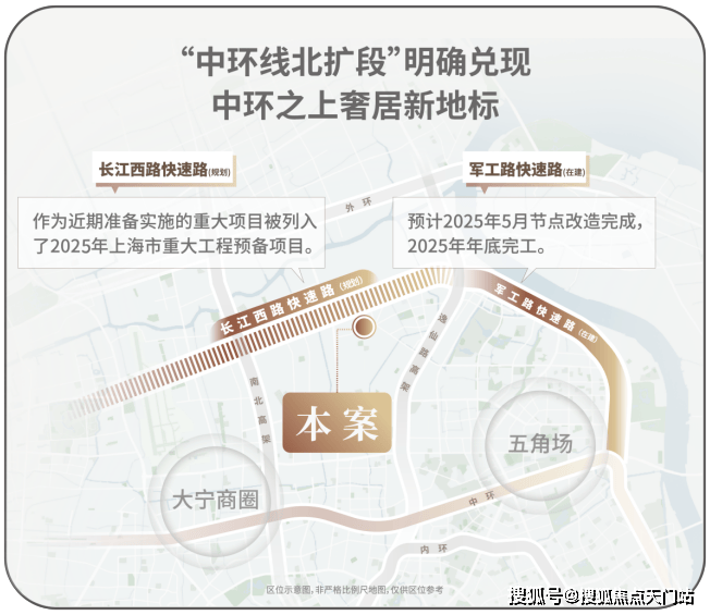作为上海市重大工程,「中环北抬」通过军工路、长江西路、沪太路三条快速路互联,重构浦西北交通骨架。这项工程不仅延伸中环线,更通过立体路网打造串联宝山、杨浦、静安的「城市交通脊梁」,竣工后将形成复合功能交通带,推动沿线板块价值升级。