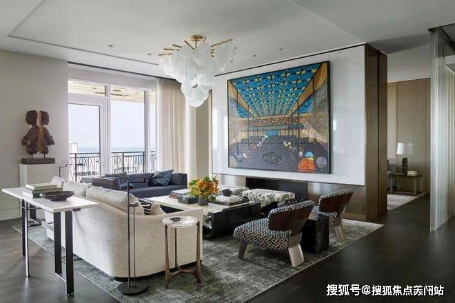 从客厅开始,整个空间都遍布着蓝色的元素,设计师以星座为主题进行设计,搭配上James Thomas的茶几、Holly Hunt的沙发、Minotti的扶手椅和Andrianna Shamaris的边桌,打造既高级又充满梦幻感的居家空间。