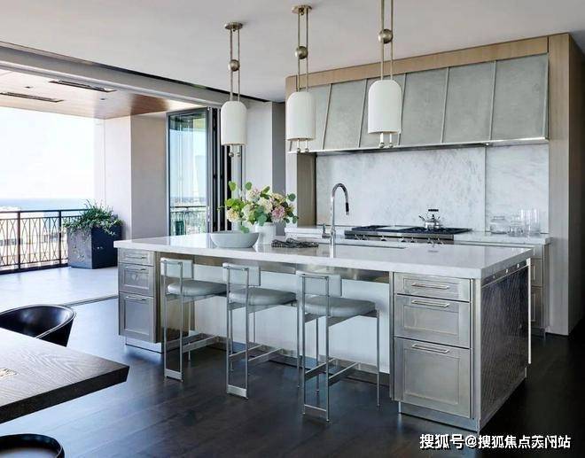 富有纹理的橡木橱柜散发着乡村气息,厨房岛上方的天窗充满了饱和的阳光,屋顶的吊灯灵感来源于工业美学,增强了工作厨房的既视感。