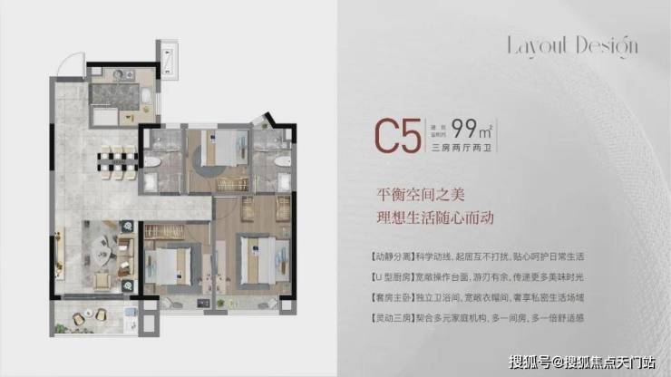 建面约99㎡3房2厅2卫,做到了 三开间朝南+动静分离+南北通透+双卧室朝南+主卧套房设计+明厨明卫,室内通透明亮。