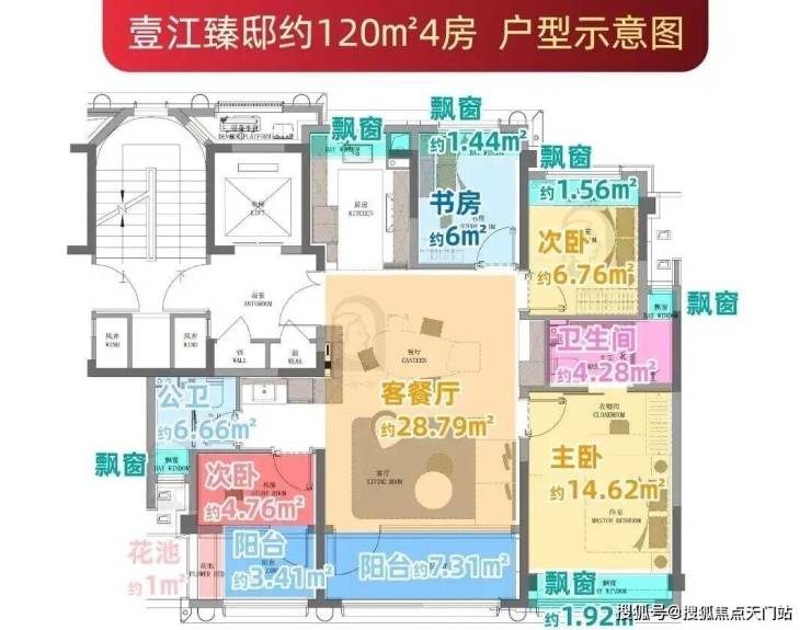 建面约120㎡户型通过6个飘窗、2个南向阳台(赠送一半面积)及独享约5㎡电梯厅,整体赠送面积约18.5㎡。
