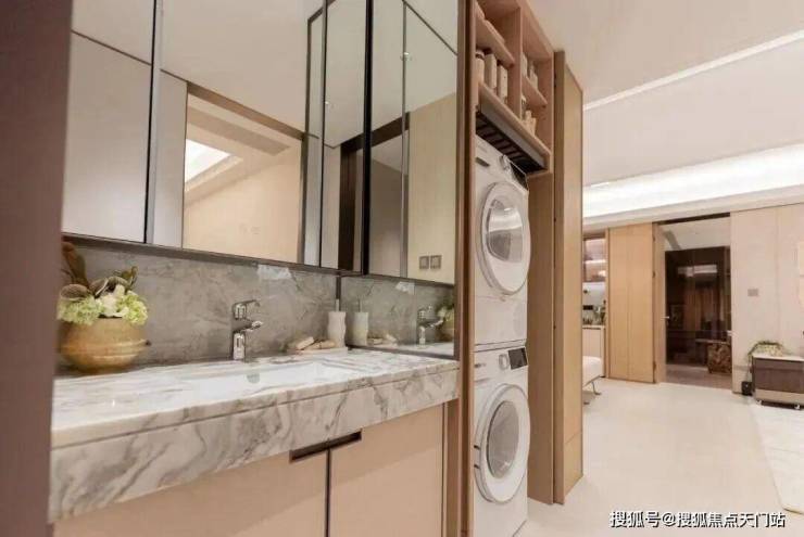 它整合了洗烘套件、分类收纳,将洗衣、烘干、收纳整理集中于一体。另外据说后期开发商可提供阳台改造隐形晾衣架服务,供业主自主选择烘干或晾晒。