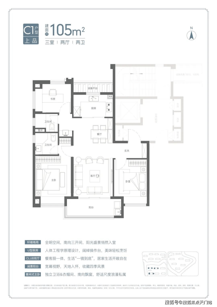 罕见宽厅设计: 约95%的宽厅设计出现在120㎡以上户型中,而项目在约105㎡面积段就做了宽厅,非常难得,这个户型进入二手房市场将极具竞争力。