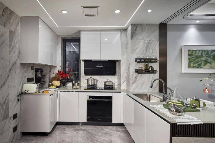 开放式厨房设计,三面环形的台面,洗涤区、烹饪区及操作台等空间划分明确。配备 方太三大件,摩恩水槽、高仪龙头,即便多一个人在厨房里帮忙,也不会拥挤。方寸之间,为家人营造一方美味空间。
