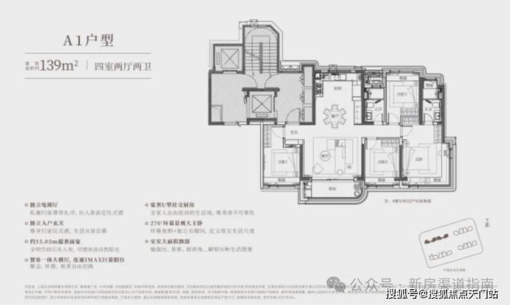 建面约139㎡4房户型,套数不多,但产品力绝对惊艳。四开间朝南,约15.05米宽的南向横厅、约1.6米进深的奢阔阳台,中环顶级享受的既视感。主卧约4.45米的进深,约4米大面宽(含飘窗),配合270°转角飘窗,是目前市面上产品力高配的户型之一,值得一冲!