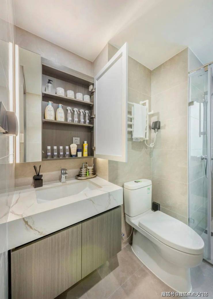 卫浴空间同样精彩,采用了汉斯格雅龙头、花洒(主卫)、百朗暖风机、摩恩龙头等高端品牌,像隐形地漏、镜柜内置插座等细节都考量到位!