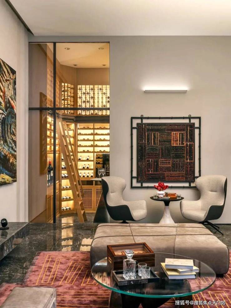 在对角,我们开辟了一面落地窗展示酒窖,展现主人的收藏。温暖的酒窖灯光和壁炉光线映照在白橡木酒架上,为客厅带来温暖舒适的氛围。