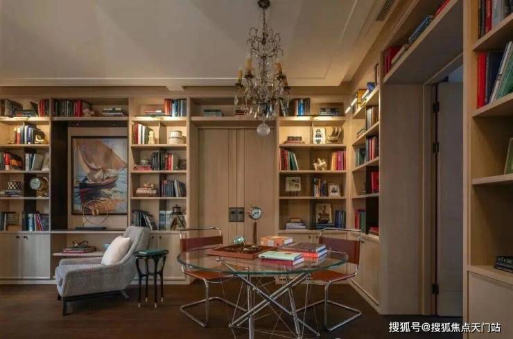 在客厅中,两个展示架巧妙地将空间分隔成主客厅区和休闲室,营造出一个与建筑尺度交相辉映的层次空间。