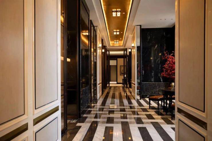 约30米的艺术连廊,借鉴PRADA荣宅多立克柱式以及和平饭店的拱形廊道,摩登海派,魅力十足: