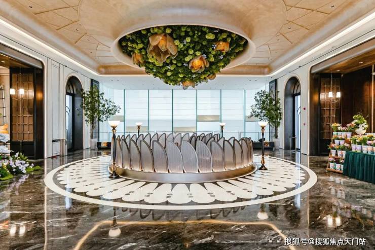 大门口的水景采用了龙鳞水纹的造型。在现场,会有种身处顶奢酒店入户大堂的观感。