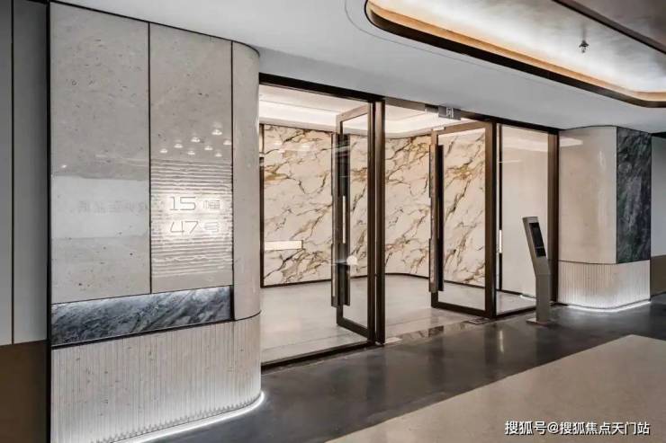 入户大厅的部分外墙上也采用香槟金与部分灰色石材,门头雨棚采用香槟金色弧形装饰,搭配大玻璃面,尊崇感呼之欲出。