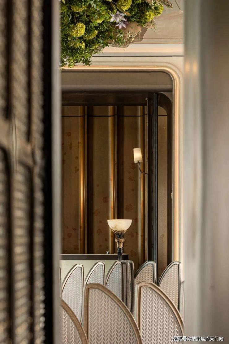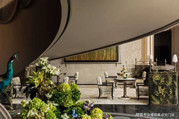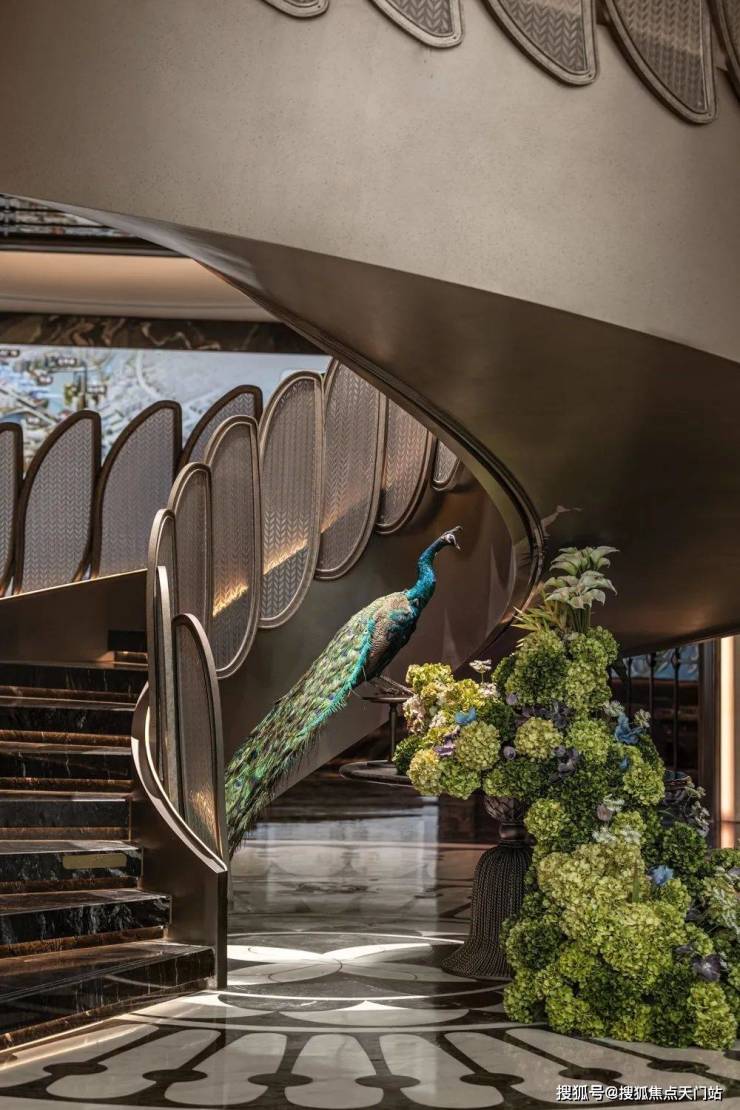 循着艺术楼梯的引导向下,空间氛围悄然流转,步“绿意花园”的静谧之境。楼梯在此延续其艺术生命,扶手的曲线模拟藤蔓缠绕的意象,点缀着象征新芽的精致构件,成为连接“礼序”与“绿意”的生命纽带,栩栩如生的孔雀装置站立在花丛一旁,寓意人与自然和谐共处。