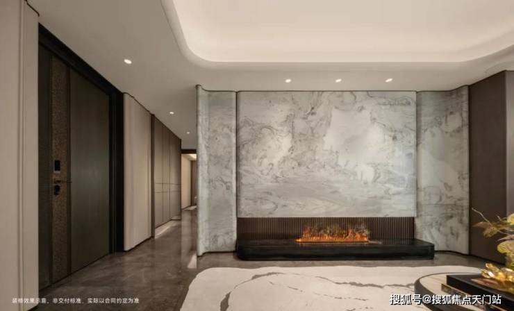 客厅背景墙的“烟雨江南”天然大理石,不同于传统平面背景墙,通过弧度及立体的造型处理,并镶嵌不锈钢材质,对于金茂而言,比奢石昂贵的,是让奢石真正与空间气场融为一体。