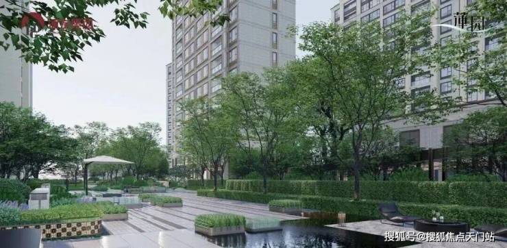 中央水韵庭院以「叠水莲池」为理念打造多层次的水景体系,叠水瀑布形成动态的水流韵律,池畔大理石打造的休憩长桌,成为被绿意环抱的林下空间,氛围相当惬意~