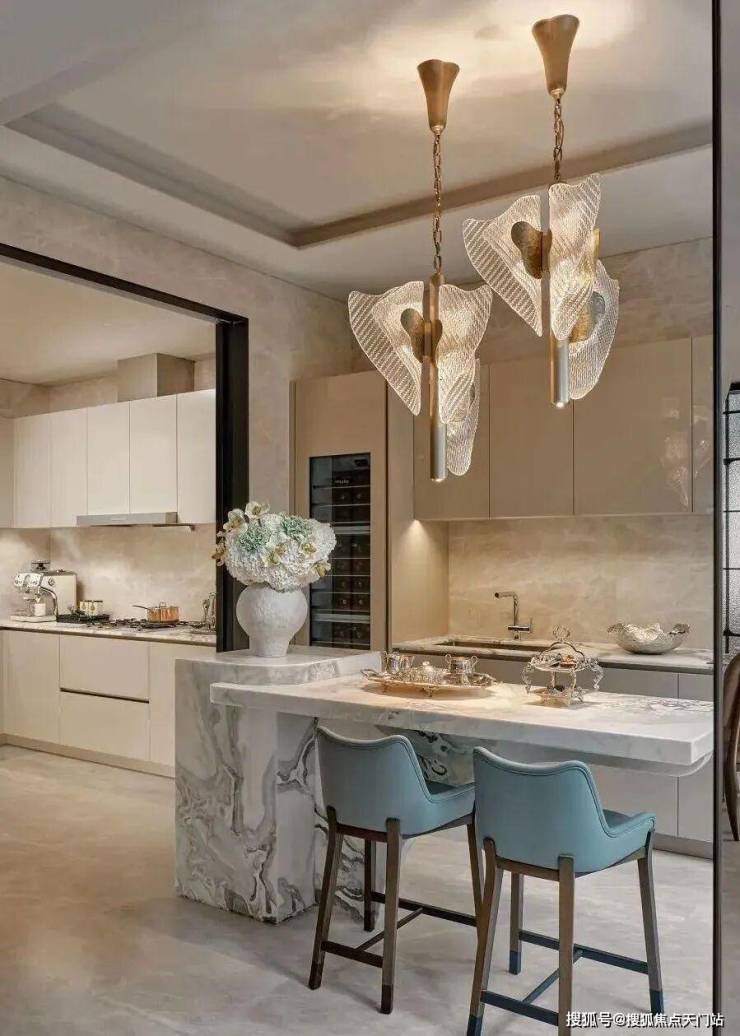 主厅核心区悬浮式定制柜体,银箔与丝绸在几何切割中构建中式基因,毕加索石材的天然裂变肌理成为天然艺术装置。瀑布吊灯以流体力学演绎东方留白,让光影在岩板表面生长出动态水墨意境。