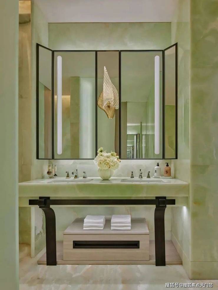 顶层下午茶区以淡绿为底,壁炉暖光漫过手绘地毯的肌理,将社交场域沉淀为冥想容器;主人房墙面缟玛瑙(Onyx)的天然流痕,也与一层屏风暗纹形成时空对位,光影在矿物晶体中生长出私密的诗。
