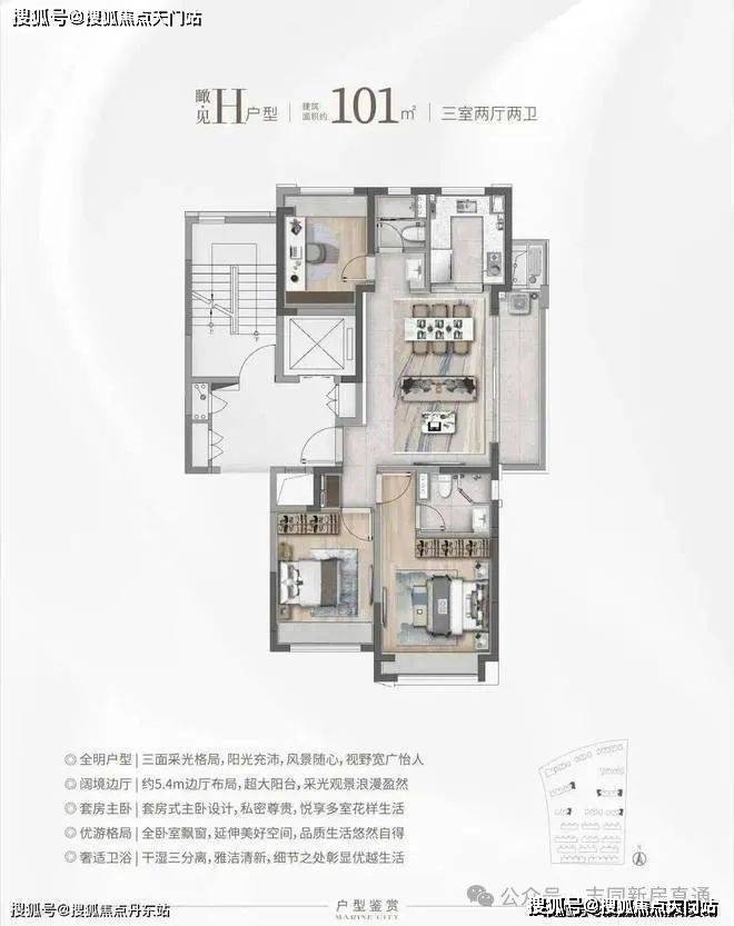 ③建面约101㎡H户型:三面采光,全能景观王炸边厅户型!
