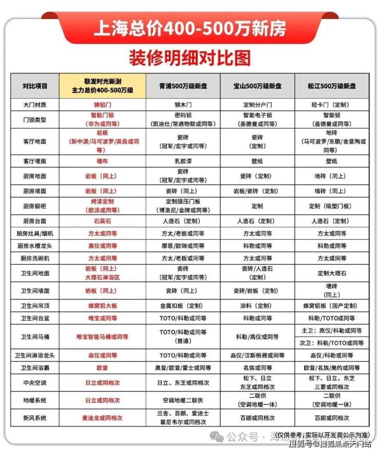 我把各区目前四百万比较热门的新房的装修标准做了横向对比:
