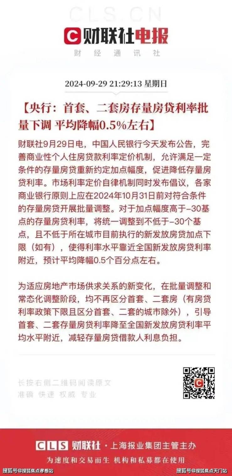 9月29日晚间,央行发布公告,宣布完善商业性个人住房贷款利率定价机制。允许满足一定条件的存量房贷重新约定加点幅度,促进降低存量房贷利率。市场期待已久的存量房贷利率调整政策正式落地。