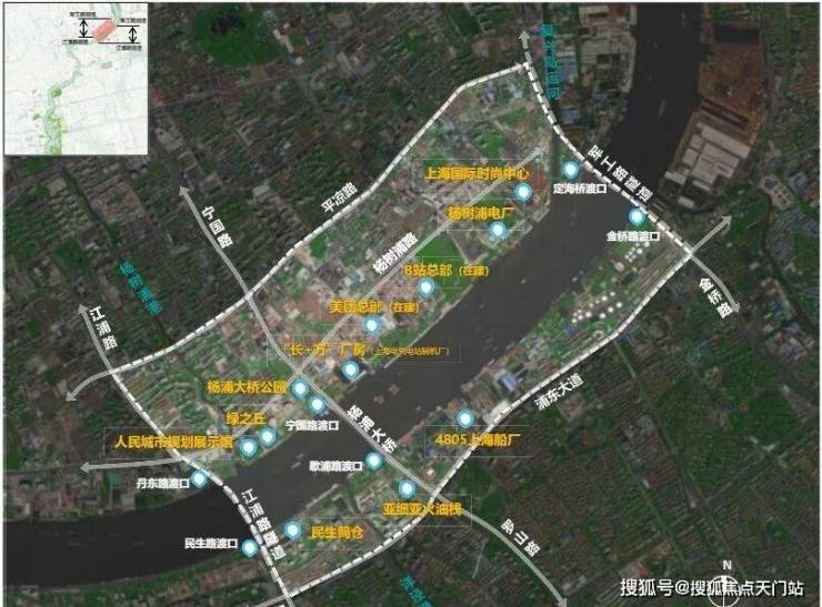 在杨浦滨江版九宫格中,主要是高端住宅+1块风貌商办,而紧邻九宫格的四至方位可以看到: