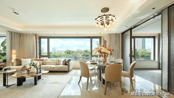 超16米的连续景观面:客厅、餐厅甚至主卧等主要房间都能享受到这一视野,整个家的采光和观景效果极佳。