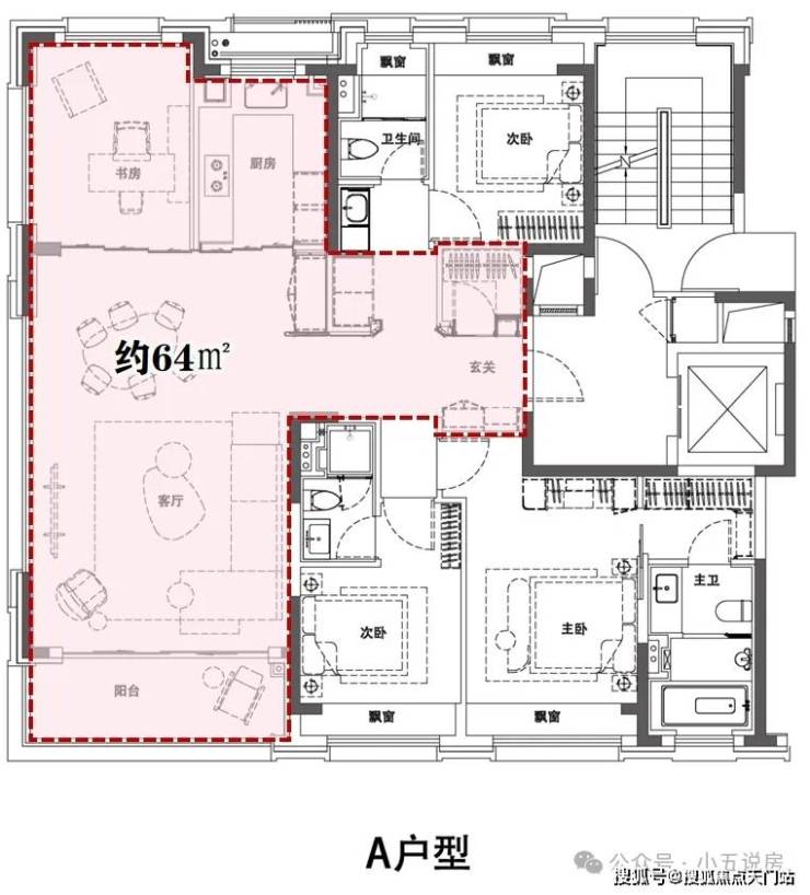 · LDKB一体化公区:客厅、餐厅、厨房、阳台与书房融为一体,形成通透敞亮的整体空间,面积达到了惊人的约 64㎡!