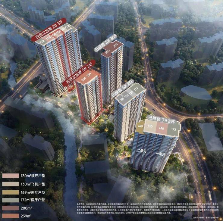 四批次推售2#、5#楼计103套房源!类一梯一户无连廊设计、装标4000元/m²;前期少量建面约130-200m²3-4房!