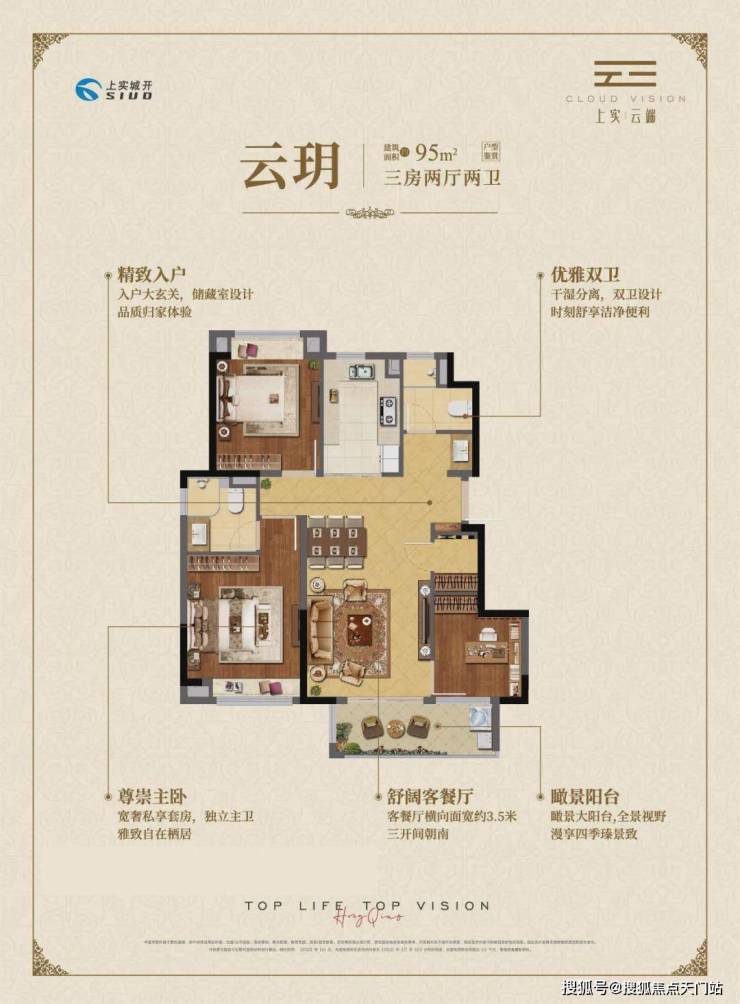 项目目前只剩95㎡的三房两厅两卫户型在售,95㎡的户型宽适,尺度感完全不输市面上百余平的三房户型。