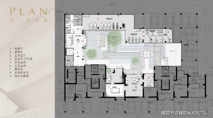 高端运动主题下沉式会所包含室内高尔夫球场、斯诺克、健身club私人运动场域,满足高端圈层的志趣共鸣。