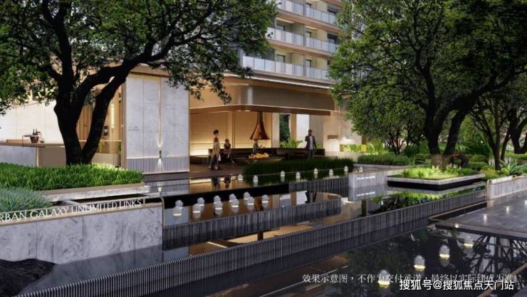 “绮丽门庭”酒店式社区入口,设环岛落客区,高定入户大堂,设飘顶弧形雨棚,顶部采用香槟金色的斜角造型 吊顶 ,搭配手工打磨的 璀璨 星空顶及氛围灯,地面铺设仿石砖,墙面基调则借鉴了华尔道夫酒店的浅米黄色系大理石,并配以精致的礼仪灯设计。