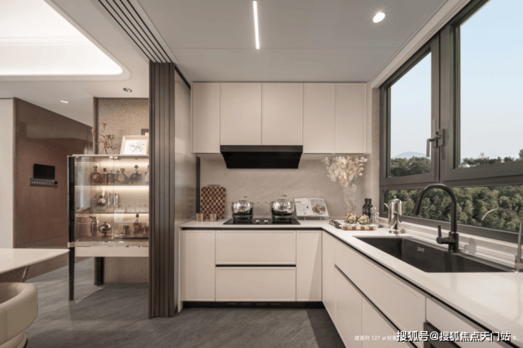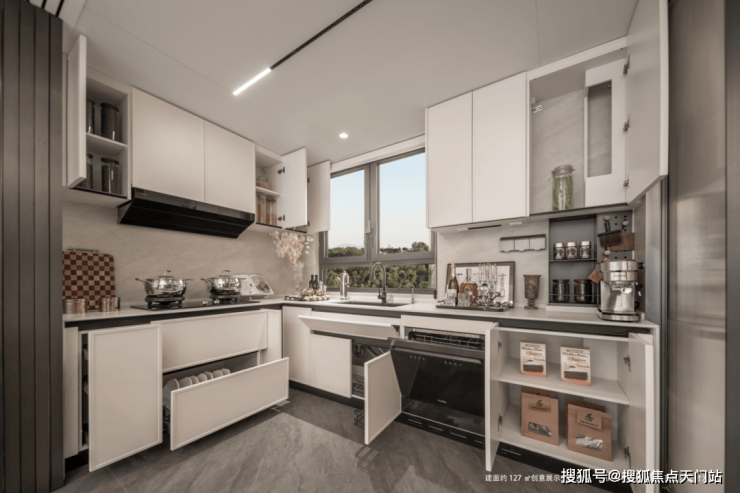 无界厨房移门采用上轨道设计,三联动移门的设计,可开可合,在不使用厨房时可以做到最大化的利用空间。