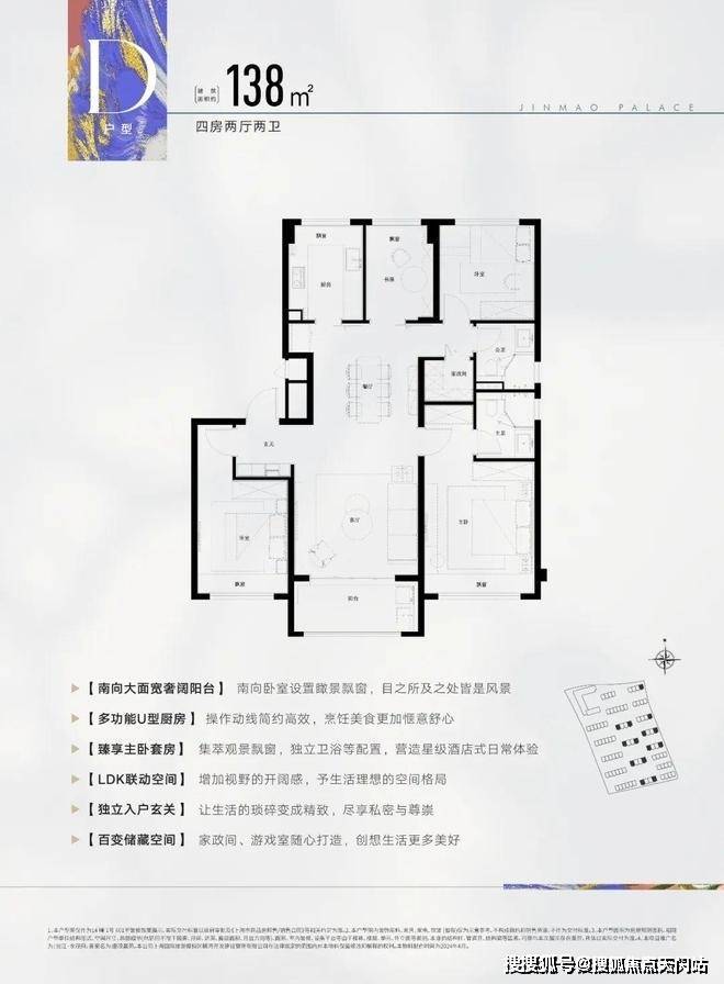 此户型为飞机户型,可以说是改善人群非常喜欢的户型,建面约138㎡4房2厅2卫设计,动静分区,三开间朝南,各空间尺度奢阔,还有一个大面宽景观阳台,实现功能性和舒适度兼得。