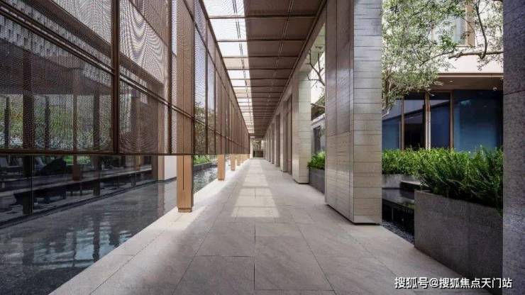 归家路上漫步于水榭光廊,阳光透过格栅在地上形成斑驳的光影,与单侧的水景波动的涟漪互动,让人在潜移默化中,获得身心的舒缓。