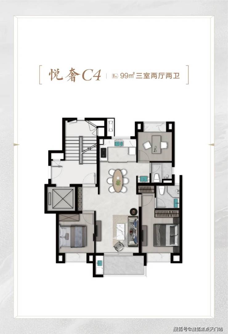 再比如 C6悦尊户型, 建面约96㎡3房2厅2卫,比C4悦奢户型少3㎡,总价也适当降低。 C4户型该有的优点,也全都有,比如: