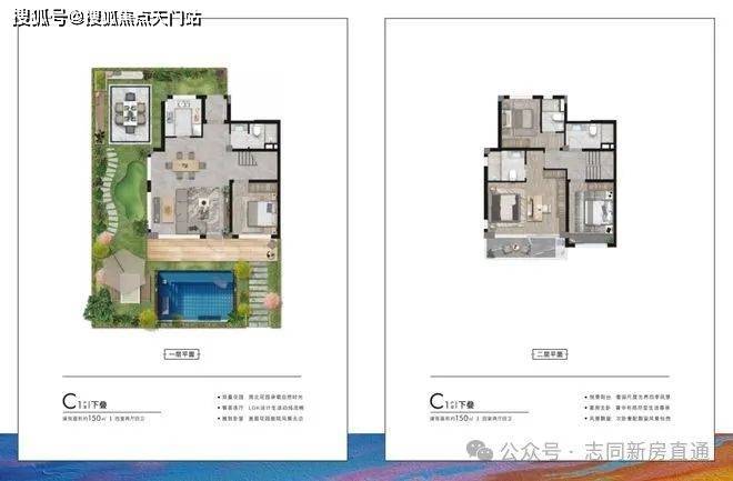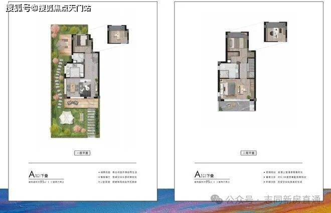 来看户型,面积段有两种——建面约 95㎡下叠、上叠;建面约150㎡下叠、上叠。