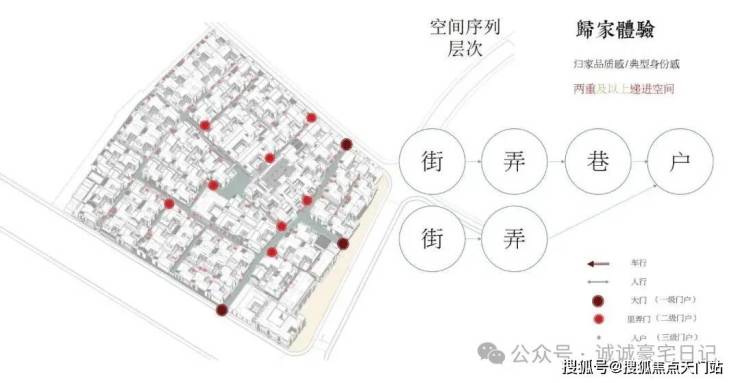 士林润园社区规划可分为蓬莱路城市公共景观以及社区内部景观两个部分,其中市政绿地衔接于上海2035城市总体规划中“蓝绿丝带”的上位条件要求,社区内部街巷空间形成空间序列形成递进的层次,将归家体验的序列依次展开,形成城市街道→入口(一级门户)→街巷→节点空间→里弄门(二级门户)→合院入户(三级门户)的方式,基本可保证大多数住户可体验到两重以上的空间递进。
