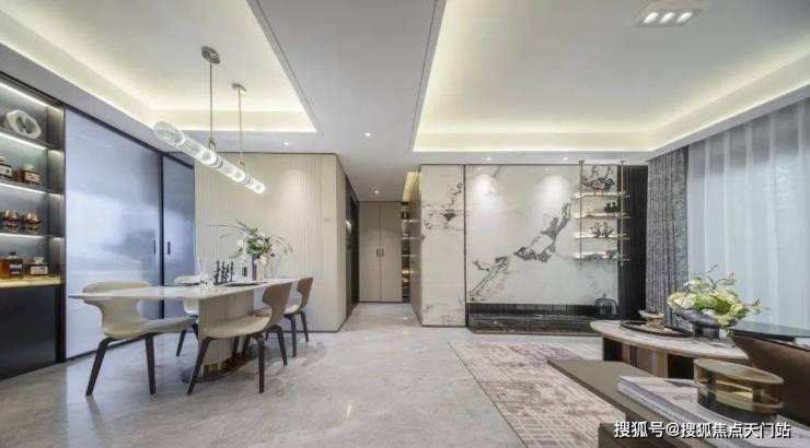 金茂定制壁布/墙纸:结合 芬迪白岩板打造的客厅背景墙,营造独特的归家氛围。