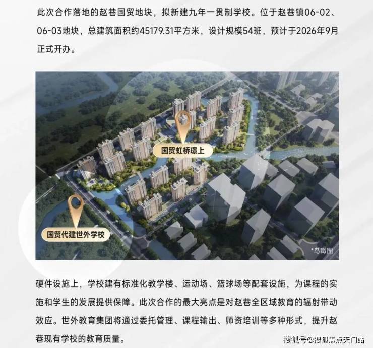 9月5日“世外”正式官宣落定赵巷,这所世外托管的公办九年制学校为国贸代建学校,与项目仅一路之隔,未来大概率对口。 (期房不承诺学区,学区划分以教育局公布为准)。