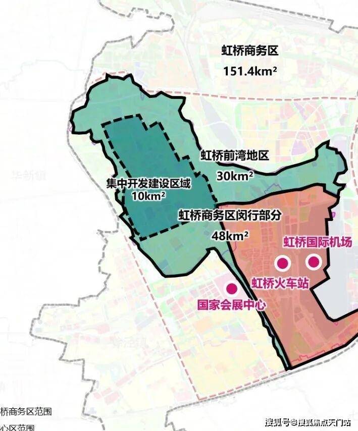 众所周知,虹桥商务区由长宁区、闵行区、青浦区以及嘉定区这4个区各自的一部分面积组成,总规划面积达到151平方公里,其中隶属于长宁区的部分称为东虹桥,隶属于青浦区的部分称为西虹桥,隶属于嘉定区的部分称为北虹桥,隶属于闵行区的部分则有48平方公里,占虹桥商务区总面积近1/3,而虹桥商务区闵行区部分又分为两部分——18平方公里的虹桥枢纽核心片区以及30平方公里的前湾片区。