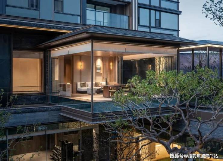再往里走就是近460㎡的下沉式庭院 精选太行山金景石堆叠成小山丘,引进溪水汇聚成池塘,并移栽岭南珍贵的古桩铁冬青和中华原生乌桕树,形成一幅立体山水画卷。