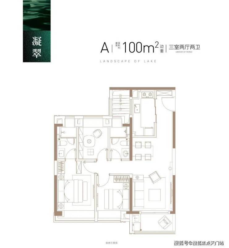 建面约100㎡3房2厅2卫, 做到了三开间朝南+主卧套房设计+动静分离+全卧室带飘窗,功能性和尺度感完美结合的3房户型。