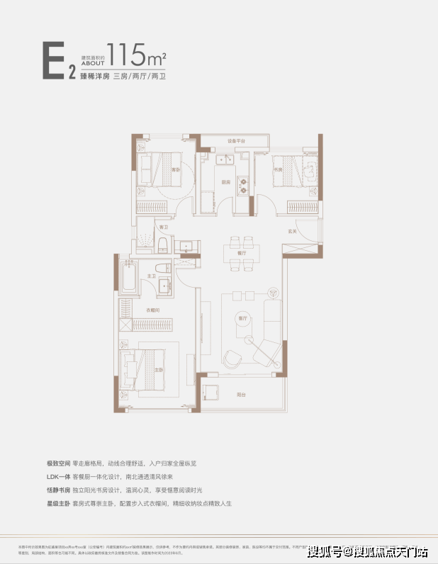建面约140㎡四房:三开间朝南户型,南北通透,采光条件优质,客厅明亮宽敞,彰显大气布局。