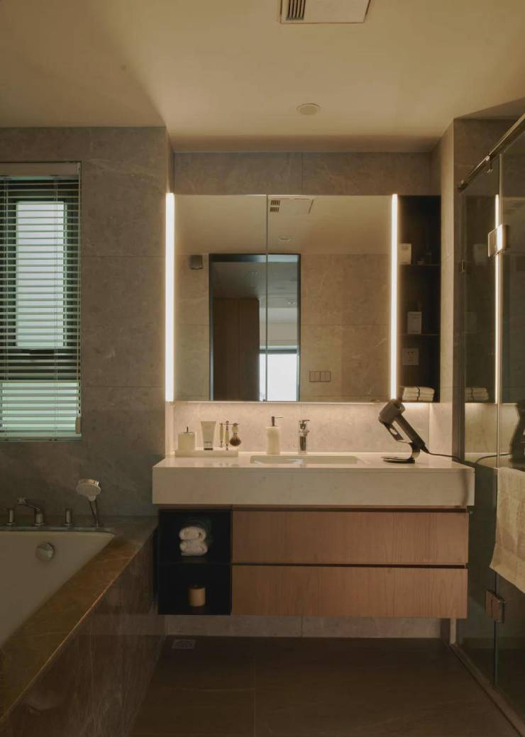 卫浴空间同样精彩,采用了汉斯格雅龙头、花洒(主卫)、百朗暖风机、摩恩龙头等高端品牌,像隐形地漏、镜柜内置插座等细节都考量到位!