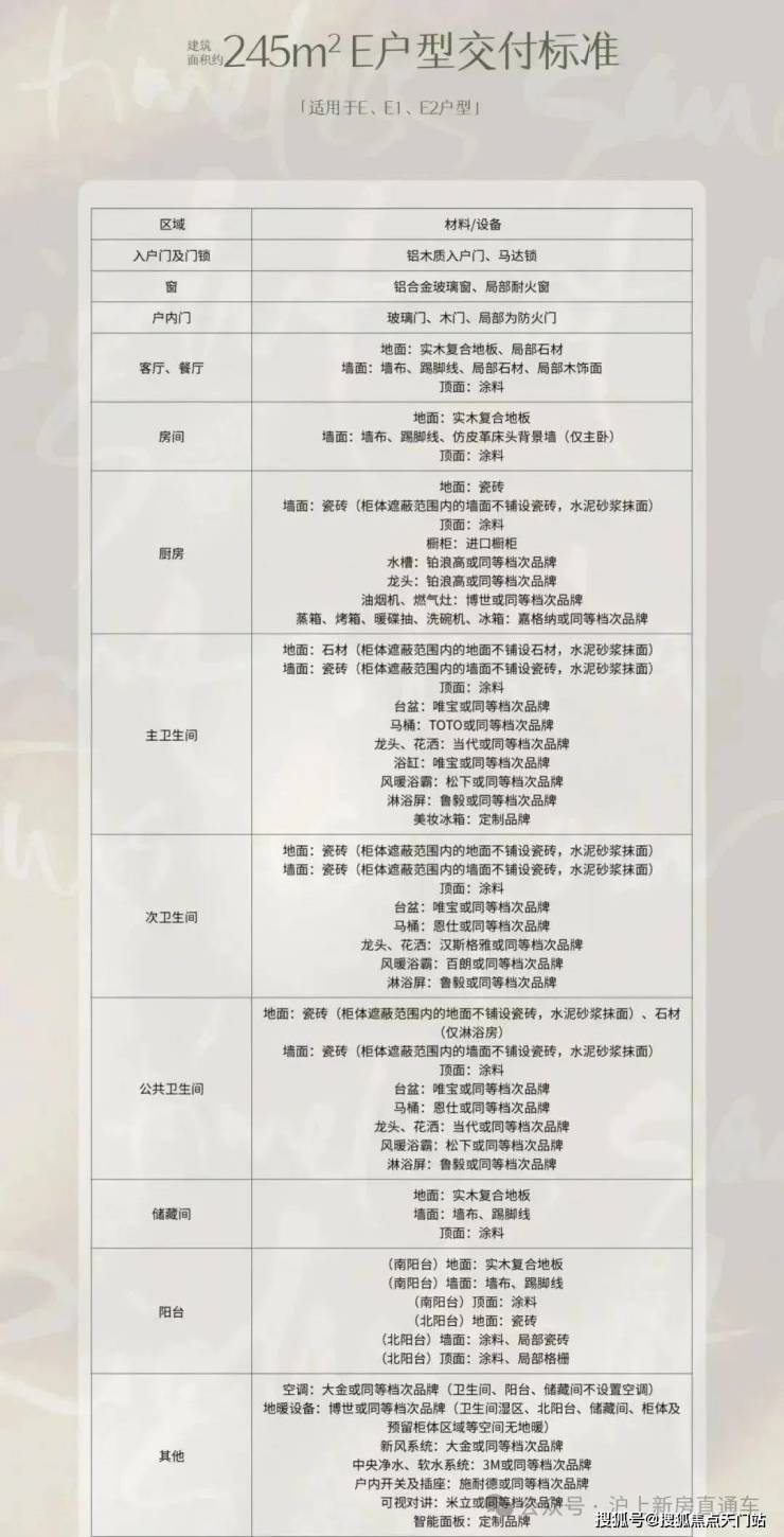 卧室实木复合地板,客餐、书房+三个卫生间地面台面全部天然石材;卧室壁布/木饰面/皮革,餐厅/卫生间/全部天然石材;厨房大面积石英石台面,嘉格纳(或同档次)7件套(灶具+油烟机+洗碗机+冷冻、冷藏冰箱+蒸汽烤箱+酒柜)!水槽龙头等:铂浪高/弗兰卡/高仪(或同档次)品牌。