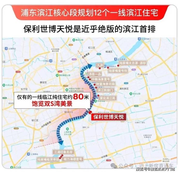 ①保利世博天悦是近乎绝版的 滨江首排,直线距离黄浦江只有约80米,与江几乎“触手可及”